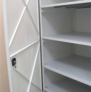 Секция стеллажа закрывается двумя сетчатыми дверями, что позволяет уменьшить их собственный вес. Общая конструкция таких металлических стеллажей с дверями устойчива, надежна и проста в монтаже и эксплуатации.